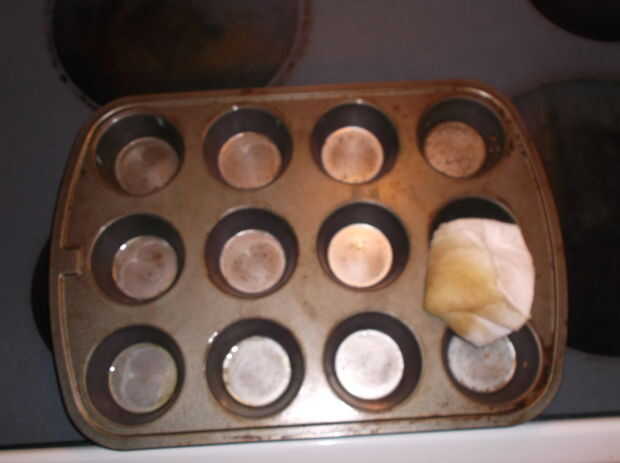 Vierta la masa mezclada en los pozos. Cada uno debe ser alrededor de ¾ completo.