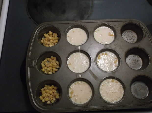 Colocar una capa de pepitas de maíz congelado en la parte inferior de cada muffin bien.