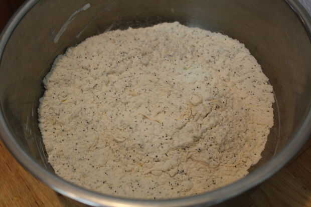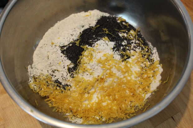 En otro tazón mediano, mezcle las harinas, polvo de hornear, bicarbonato de sodio, sal, semillas de amapola y ralladura de limón. (si usted ya mezclada la ralladura de limón con el azúcar como lo antes sugerido, entonces obviamente, que no ponerlo en este tazón de fuente)