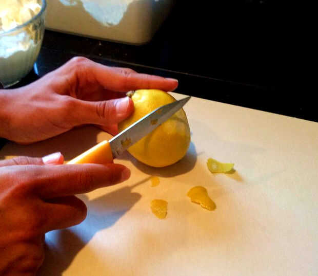 Si no tienes una zester limón, puede Pele los limones como se muestra en la imagen. Es una forma relativamente fácil ir. Después es ralladura el limón entero, la cantidad de ralladura debe estar aproximadamente dos cucharaditas vale la pena.