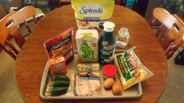 Muffins de maíz sin gluten elaborado con tocino desmenuzado, pimientos jalapeños, Extra queso de Cheddar fuerte desmenuzado y la mantequilla (1 / 4 paso)