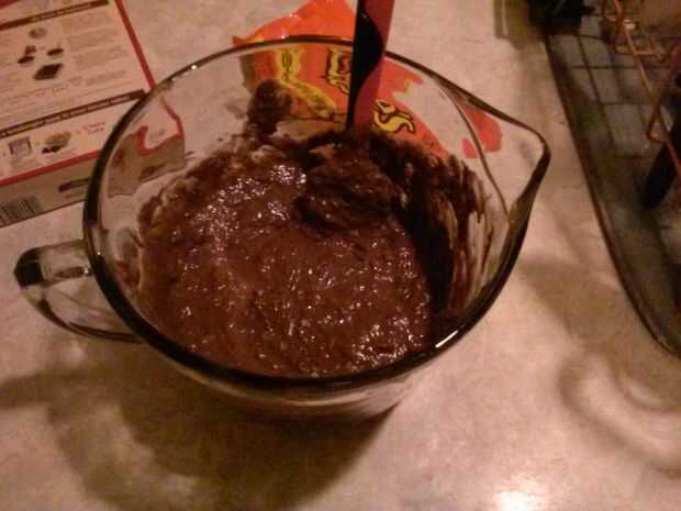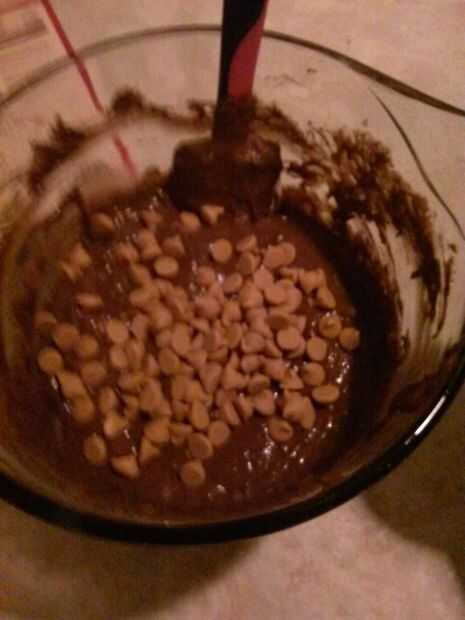 Añadir la mezcla de puré de banana y pastel a un tazón grande. Mezclar con una espátula de goma hasta que se combina la mezcla (mezcla podría ser ligeramente abultada debido a la textura del plátano, pero debería incluirse completamente la mezcla seca). A continuación, agregue los chips de mantequilla de maní hasta que disperse uniformemente (Nota: foto muestra chips añadido pero no mezcladas.)