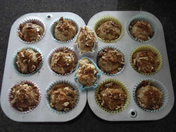 Vierta la mezcla en las tazas del mollete. Se recomienda utilizar una cuchara de helado para distribuir la masa uniformemente entre todos para 12 panecillos. Mezclar el azúcar con las nueces picadas sobrantes. Espolvoree esta mezcla encima de cada muffin.