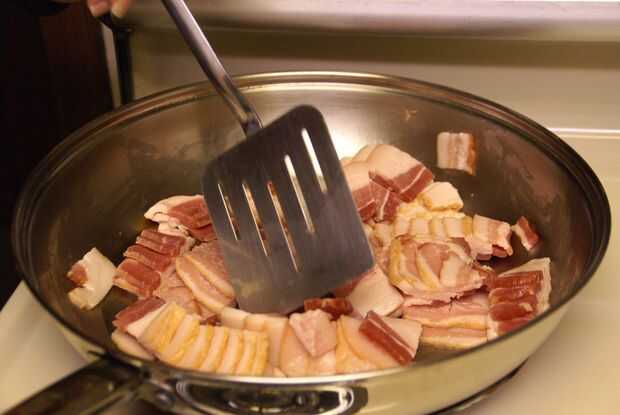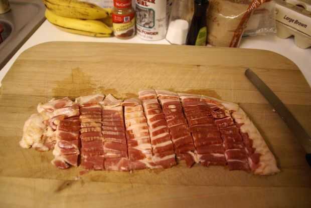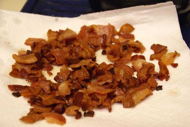 Dice arriba tu tocino tan fino como sea posible. Yo sólo mina picados 1/2 pulgadas y aunque su sabor increíbles en el producto acabado, creo que sería incluso mejor si ellos eran más finamente picados. Cuando ha dados su lugar posterior en una gran sartén y cocine hasta crujientes. Secar el tocino sobre toalla de papel para dejar enfriar y reservar.