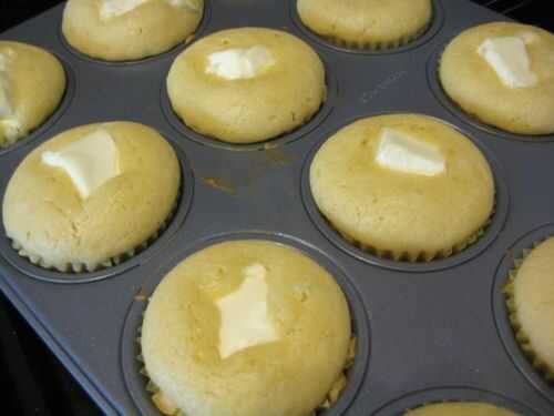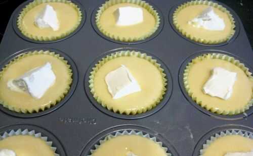 Abrir el bloque de queso crema. Cortar en 12 trozos iguales. Coloque una pieza en cada muffin.