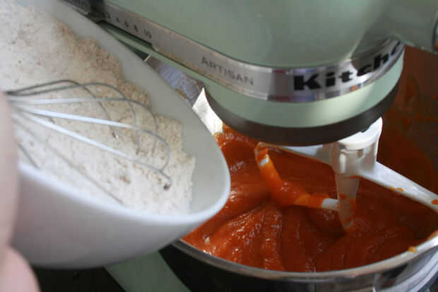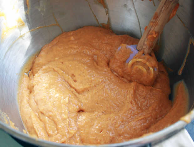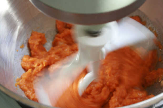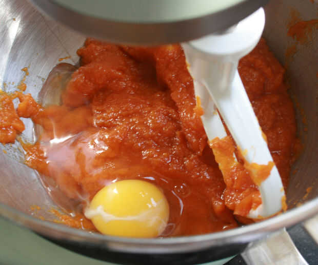 Mezcla de conservas de calabaza, el aceite y el azúcar junto, ya sea a mano o con un mezclador de baja.
