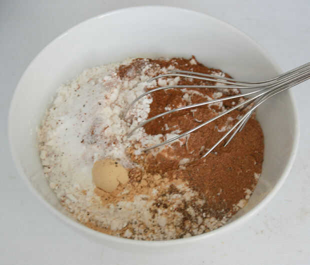 Batir juntos el harina, polvo de hornear, bicarbonato, sal y especias.