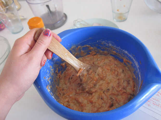Mezclar bien todos los ingredientes y agregar los secos última: flor, polvo de hornear, bicarbonato de sodio, aroma de vainilla, especias, nueces, coco.