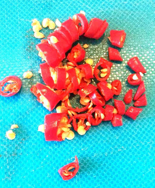 7. Corte los chiles finamente. Les de la capa en un poco de azúcar (como lo haría para que arándanos, para evitar que se depositen en el fondo de tus muffins). Ahora poner a la masa del muffin.