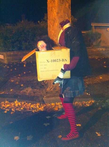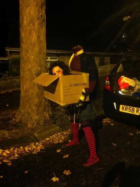 Os adjunto el falso medio cuerpo a mi espalda y poner mi cabeza a través de la caja, sucia la ropa de bebé del polvo y de la sangre y forman como una cara de zomby, blanco con verde y roja sangre! Cal también pone más sangre en la caja.