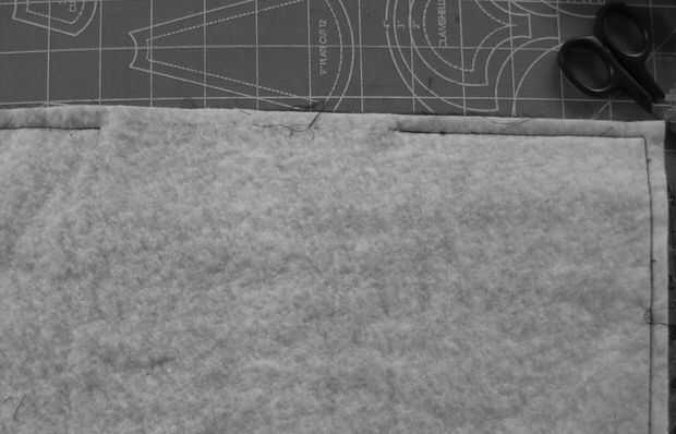 Coloque el paño grueso y suave en la superficie de la plancha, con el lado desigual, fusible hacia arriba. Alinee una de las piezas de la tela de la bolsa en la parte superior del paño grueso y suave (boca de lado derecho arriba) y el fusible en su lugar. Deje que se enfríe.