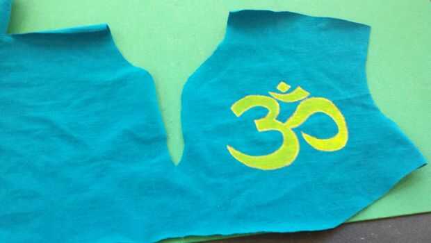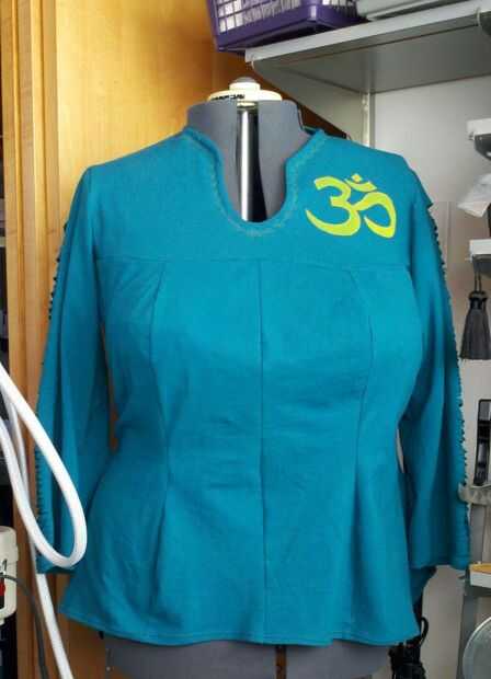 Defendido el símbolo de Om en la seda proyección clase en la tienda de tecnología, San José, impartido por Karen Davis (http://www.techshop.ws). Al tiempo proyectó en yardas, no la prenda. La hice en la tienda de tecnología! Me permitió tener cierta flexibilidad en la colocación del gráfico antes de que invertí todo el tiempo en construcción. Pude sobreponer la pieza para colocarlo exactamente donde quería que el diseño aparezca. Antes de incluso cortarlo hacia fuera, solía una pluma de oro de tela metálica con ribetes de oro, esbozar el gráfico y añadir un poco más interés visual.
