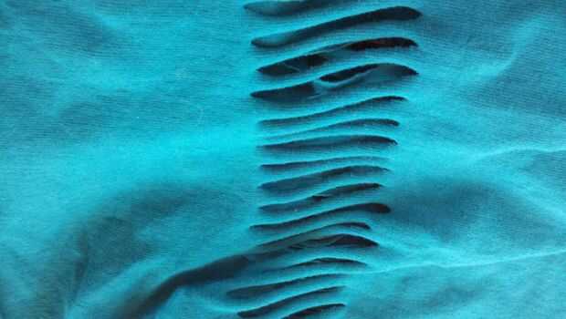 El punto era un poco pesado por el calor del verano, así que decido construir en cierta ventilación y añadir un elemento de diseño al mismo tiempo. Corté las rajas en el centro de la manga de cerca el hombro casi hasta el borde de la manga. Y luego saqué a la tela aparte, que hacen que la wrungs de la tela escalera para rizar y esto abriendo pequeñas ventanas entre cada uno de ellos. Luego cosí la prenda con una remalladora de 3 hilos que conserva el estiramiento de la tela en las costuras y recortar los márgenes a la vez.