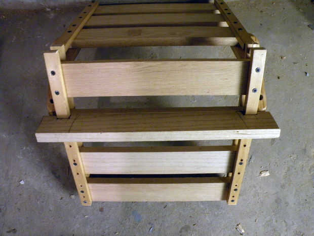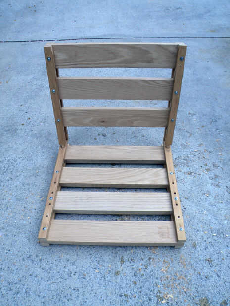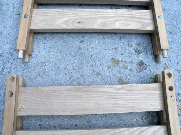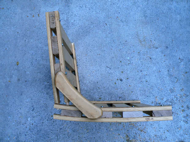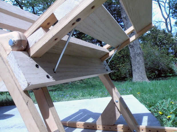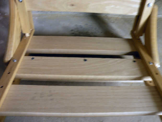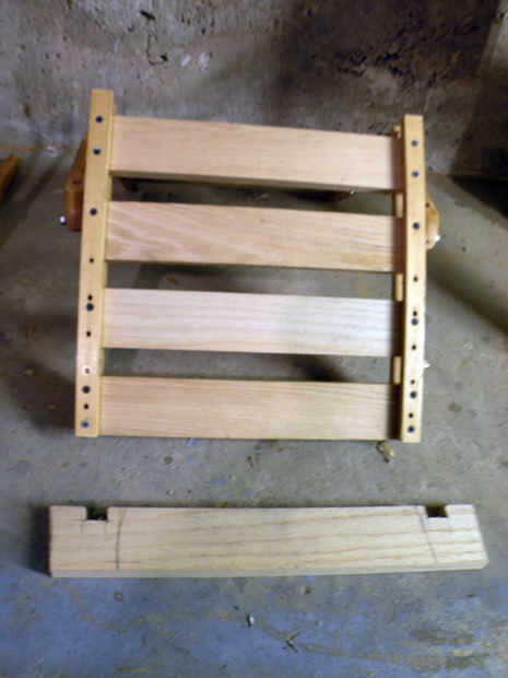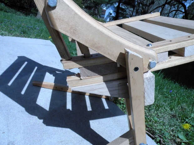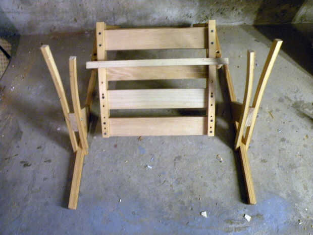 La unidad del asiento se sientan abajo en el "Ys" abiertos de las piernas. El apoyo en la parte inferior del tercer listón debe deslizarse hacia abajo de la parte frontal inclinada de las piernas. Enroscar y pegar liberalmente. Use lo que sobra madera tienes que añadir un refuerzo transversal entre las piernas y dos cuñas en la parte posterior de la parte inferior del asiento. También puse en los dos tornillos largos que habían celebrado las empuñaduras en lugar debajo del asiento en la parte delantera como un refuerzo más.