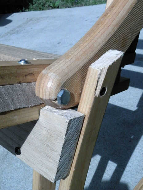 Utilice los soportes de la axila para triangular la parte posterior y asiento común. Conecte 6 "x 3/8" lag pernos perforados en la veta de los listones del asiento.