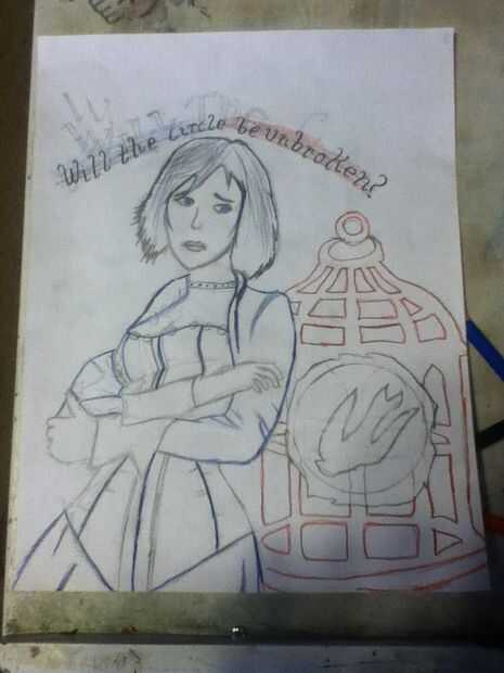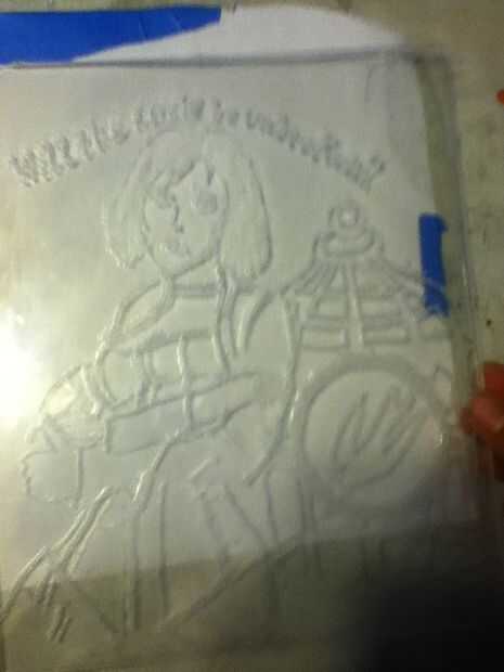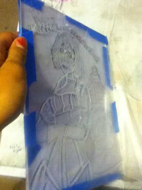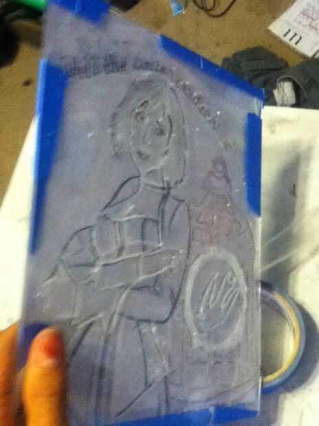 Ahora es donde usted saca su herramienta rotatoria con grabado poco y manos a la obra. Pasé esto por primer corte tres piezas de acrílico un poco más grande que el papel, estas piezas son las capas de colores, ahora el dibujo de la cinta y/o imprimir la imagen o lo que sea para el de las piezas. Ahora Asegúrese de que en esta pieza que sólo grabe las líneas para que uno capas de color. Por ejemplo, la primera capa que hice era amarillo así que sólo grabó al agua fuerte hacia fuera de la jaula y se trasladó. Una vez tengas tu capa inicial que hizo la siguiente pieza de acrílico y cinta en la parte superior el conjunto esta es por lo que no tienes ningún desplazamiento y harán cola para arriba al final. Repetir este proceso hasta que tienes todas tus capas hechas. En ciertos puntos (corsé de elizabeths por ejemplo) hay dos colores en la misma sección, esto lo hace para un efecto mucho más vibrante pero no sólo donde hace sentido... derp. Si usted decide ser rebelde y decide añadir color donde no pertenece, no detenerte, usted podría notar en la imagen final un tono azul en su cabello, un buen toque decirlo yo!