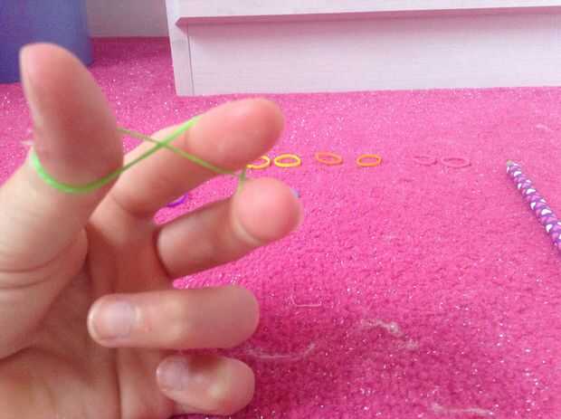 en primer lugar obtener su primera banda de goma y ponerlo en su dedo gírelo una vez luego ponerlo en el dedo siguiente luego gírelo otra vez y ponerlo en el dedo siguiente entonces por última vez gírelo otra vez y ponerlo en el dedo siguiente debe tener este aspecto. A continuación puso su próxima banda de goma del mismo color y pero que en la cima de su primera banda de goma no la torcedura.