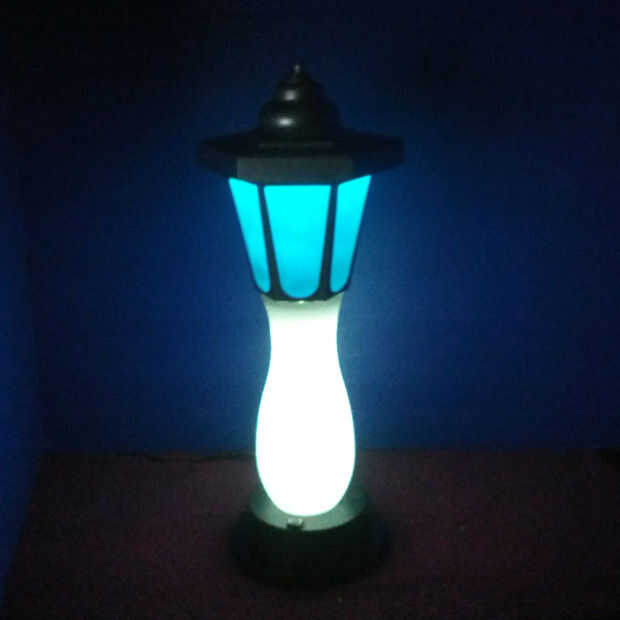 Creado a partir de un v.3 de controlador de LED de canal 8, una rota luz solar del jardín, un vaso de plástico blanco, un disco de MDF y plástico base de un juguete viejo.