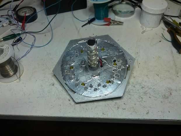 Esta luz jardín particular y un difusor interno que colgaba hacia abajo. Envolvió un viejo tubo de soldadura, aproximadamente 0.5" de diámetro con alguna cinta de aluminio entonces lo envolvió espiral hacia abajo con algunos tira de LED blanco, alrededor de 8 secciones. El difusor interno tenía los orificios perforados en su parte inferior y en la parte superior para ejecutar los cables hasta el fondo sin sombras del bastidor o en el camino de la luz.