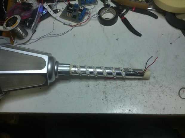 Para la tira de LED inferior, una vez que se calculó la altura total y el tamaño de la lámpara, el tubo de PVC fue cortado para caber,(step 2) enclavada en la parte inferior de la luz solar (tuvo que envolver la parte superior de cinta de algunas). La tira de LED entonces fue envuelto alrededor de la tubería de PVC (ya envuelta en cinta de aluminio) en una espiral. En la parte inferior de la tubería de un gran agujero fue perforado para alimente los cables del controlador que se encuentra en la parte superior.