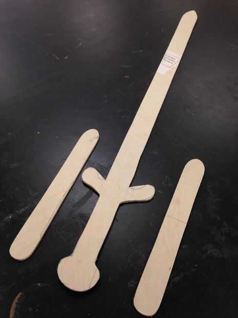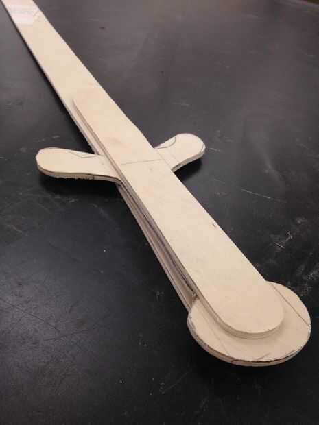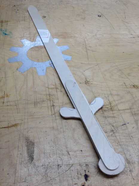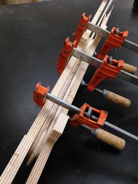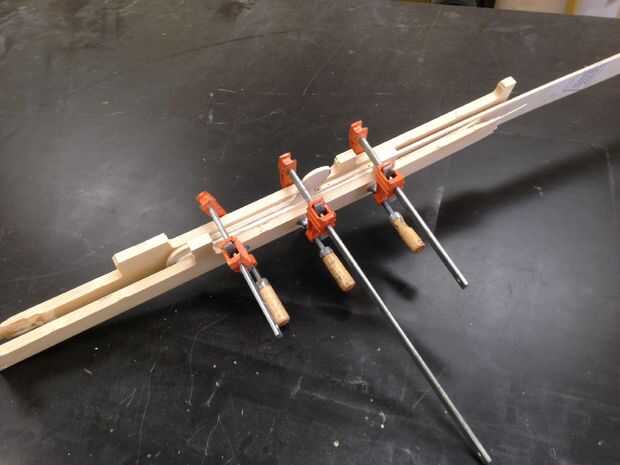 La madera es bastante flimsey por sí mismo, así que hice algunos fortalecedores para la zona de empuñadura. pegar estas en con pinzas y pegamento de madera. (restos de madera se utilizan para ayudar a la fijación)