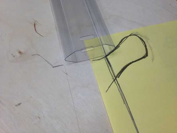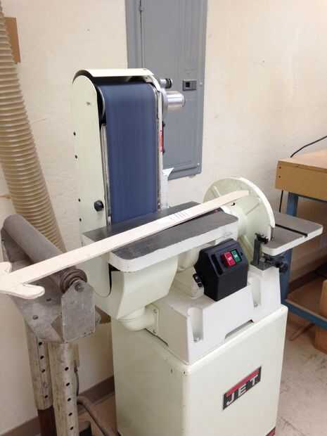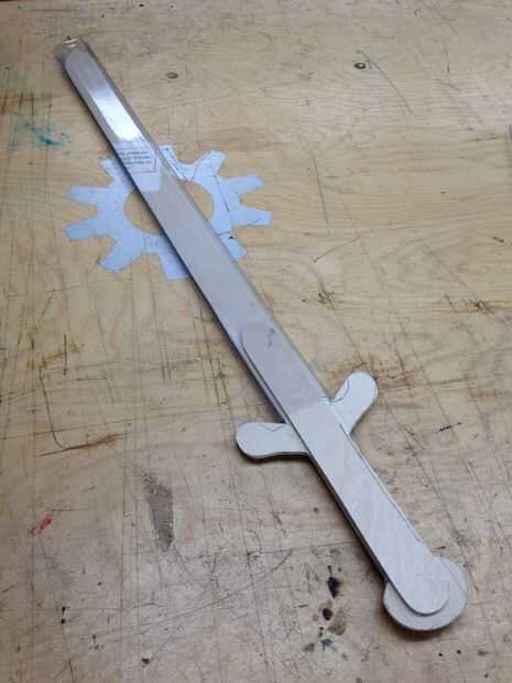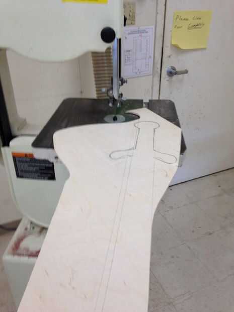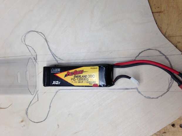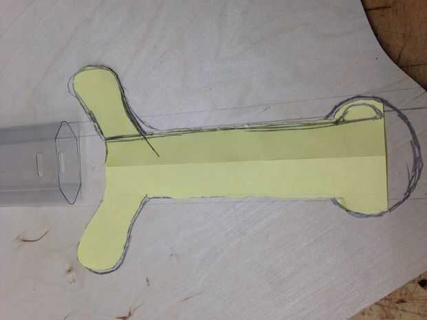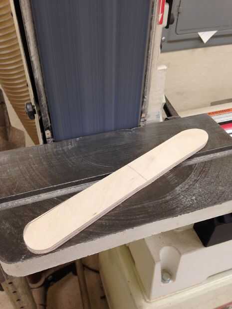 Hice un boceto rápido en un papel doblado para hacer la empuñadura simétrica y había remontado hacia fuera en algunos contrachapado de 3/8". El mango era casi correcto para una de las baterías que se estaría utilizando. Luego recórtela en la sierra. Rápida limpieza y conformación se realizó en una lijadora de banda.