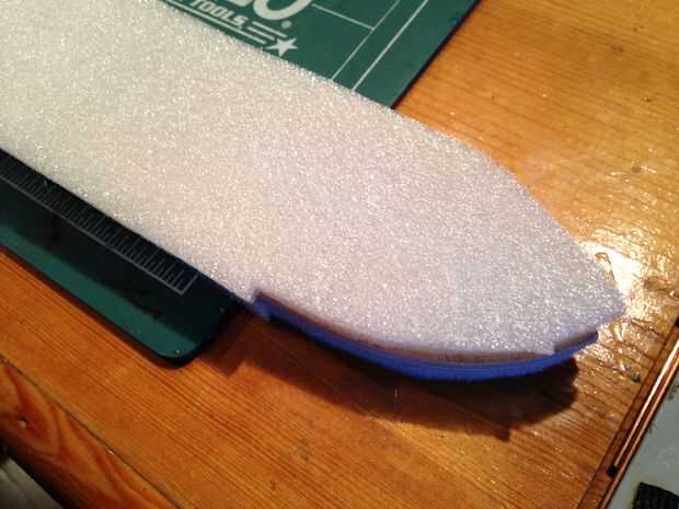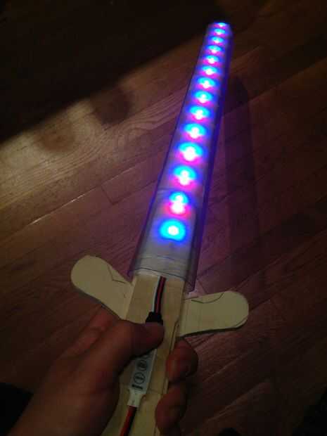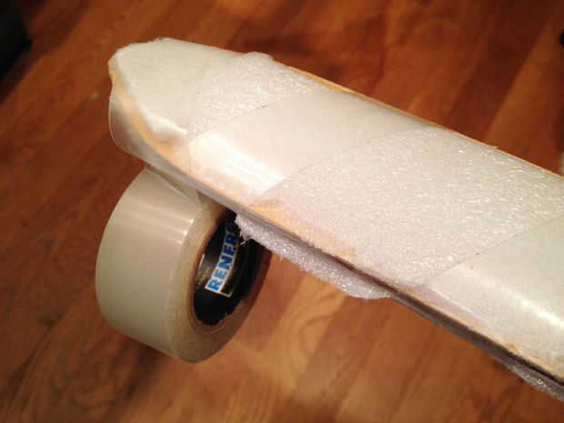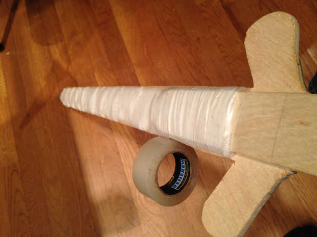 Luego envuelve la espada de espuma cubierta con cinta de hockey para enlazar todo junto.
