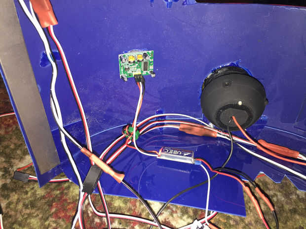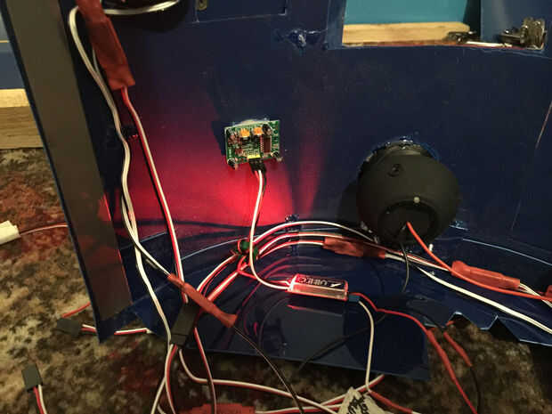 La parte siguiente fue instalar el micro servos. Estos fueron conectados al controlador de robot EZ-B v4 y calibrados a 90 grados y desconectados de EZ-B. Algunas longitudes de alambre de cobre plateado oro fueron cortadas con un extremo formado en un bucle usando alicates de punta. Cuernos de servo fueron atados, con un pequeño tornillo que va a través del lazo del alambre y en el orificio más lejano en el cuerno. Este cable sería la vinculación para las aletas. Un lazo de vinculación se hizo simplemente pegando una tuerca pequeña en el centro de la aleta. Con las aletas cerradas, se midió el alambre de cobre, doblado a 90 grados en el punto de encuentro de la tuerca, el exceso de cable había cortado y luego engancha el acoplamiento en a la tuerca. Esto se repitió en todos los servos de aleta. Los cables de extensión de servos conectados y trazados dentro de la piel, utilizando una pequeña gota de pegamento para mantener en su lugar.