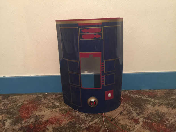 Utilizando un accesorio de taladro de diámetro, dos agujeros fueron cortados para el sensor infrarrojo altavoz y pasiva. El orador fue desmontado, quita la batería y alambres soldados a la potencia puntos. La cubierta exterior del altavoz fue pintado oro, y cuando se seca, el orador fue alimentado a través del agujero del centro y volver. Una pequeña cantidad de pegamento aplicó alrededor del altavoz y luego se coloca en la piel donde se dejó para establecer. El sensor de PIR se ajustó a la piel desde el interior, con pegamento para mantener en su lugar.