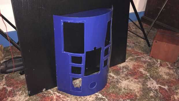 Las pieles están hechas de tres hojas de HIPS (poliestireno de alto impacto) espesor 1mm. He utilizado una hoja plana mate color azul como una tienda cerca de mi lo tenía disponible. La primera hoja se utiliza para hacer los paneles laterales y piel frontal interna. A partir de los paneles laterales, eran marcados y cortados a la medida con un cuchillo y borde recto. Los paneles fueron realmente cortar ligeramente más grandes que tienen que ser. Estos paneles fueron luego atornillar a un par de plantillas MDF semi círculo (circunferencia de la misma como los discos de marco de cuerpo). Los orificios más tarde se cortarán, razón por la cual los paneles fueron cortados un poco más grandes.