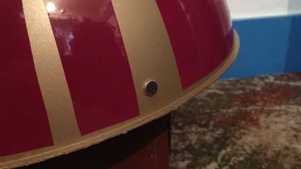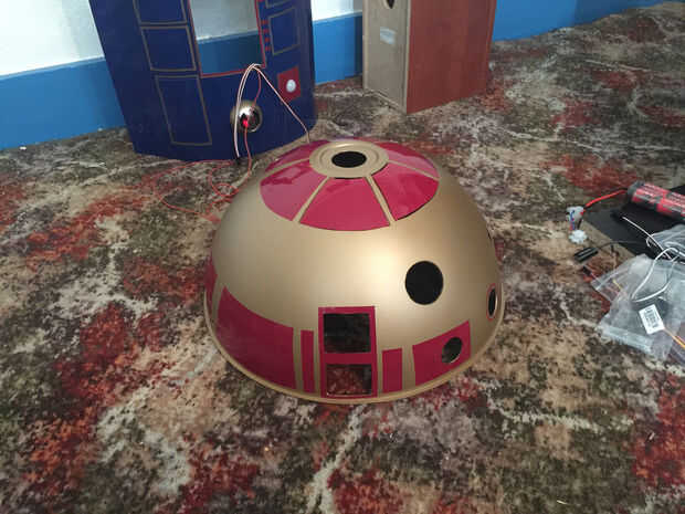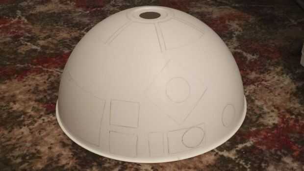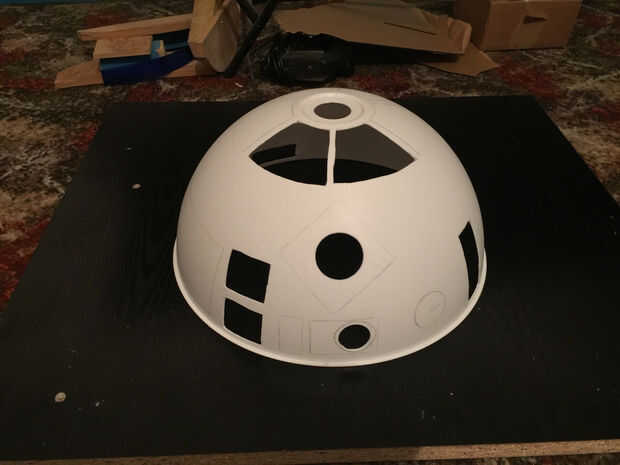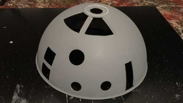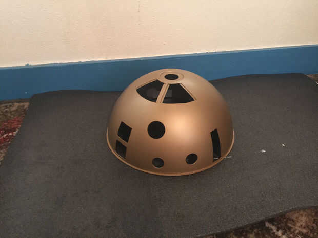 Esto se hizo de un 18" diámetro plástico pantalla que encontré en línea. Sacó de donde las luces, ocular, pantalla LCD, aleta del proyector y paneles de aleta sensor necesarios para cortar, luego cortan estas con una herramienta (Dremel en mi caso). Los bordes se frotan hacia abajo, luego con un papel de grado más fino, lija la cúpula hacia abajo para mejor adherencia de la pintura. La bóveda fue pintada y pintada de oro. Entonces el resto de la sección que debían ser Borgoña fue enmascarado de pintado, y luego la cúpula todo estaba lacada.