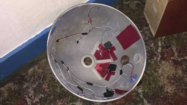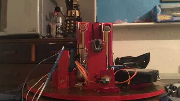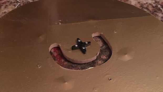 En el disco más pequeño, una pequeña sección se recorte para que el servo HD caber en a, asegurándose de que los servos engranajes era también punto muerto. Un cojinete 6" lazy Susan fue cabido a la parte inferior del disco más pequeño, y luego cuatro agujeros fueron perforados en el disco para obtener acceso al tornillo del rodamiento al disco más grande. El disco dos se montaron junto con los servos engranajes ahora sentado en el cuerno del servo. El rodamiento estaba enroscado, y un gran agujero fue perforado a través de ambos discos de aproximadamente 2 pulgadas de la servo. Luego coloqué una sierra de calar, sentado en el disco más pequeño) y un canal de 180 grados semi círculo. Aquí es donde los cables se alimente a través y moverse sin restricciones de lado a lado cuando la cúpula. El disco más grande ahora fue unido a los cuatro soportes de la sección de nivel superior de los cuerpos.