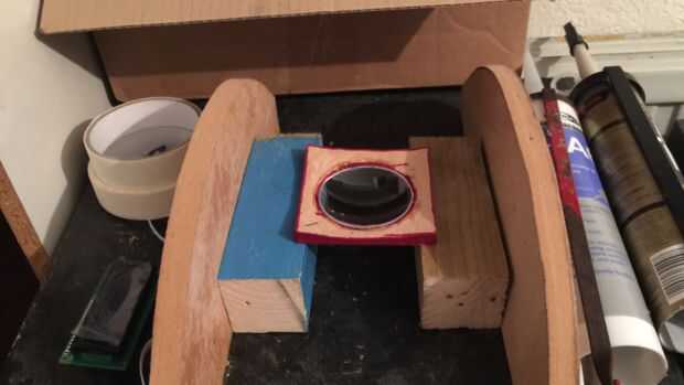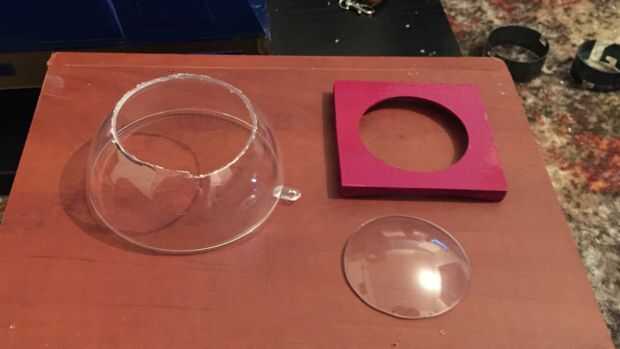 El ocular fue hecho de una pieza cuadrada de MDF con un lado lijar para emparejar el contorno de la cúpula. Esto entonces fue pintado Burdeos y claro revestido. Encontré una gran esfera transparente de plástico con tinta que compré, medida con el orificio de corte de la pieza MDF y reducir la esfera de plástico con un disco de corte Dremel para crear la lente. Personas normalmente esto pintan negro, pero quería claro para la cámara y el sensor de luz secundaria. Además, cuando esté montada, no puede ver en el lado de la cúpula mucho, y la lente tiene un aspecto tintado oscuro. Fuera de la estructura entera, el ocular es mi parte favorita.