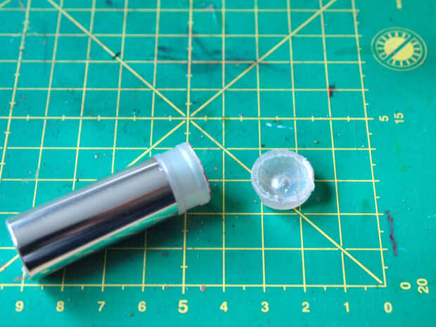 - Corte parte de la parte inferior del tubo de plata a (el bit de plástico blanco) para proporcionar más espacio libre para las herramientas que se almacenará en la base.