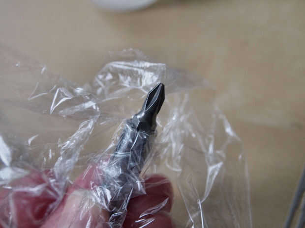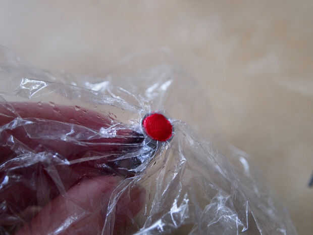 • Para hacer el sujetador de la cuchilla, primero colocan algunas envolturas de plástico en el sostenedor del pedacito (para evitar el Sugru se pegue).