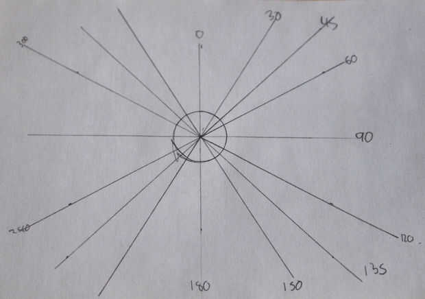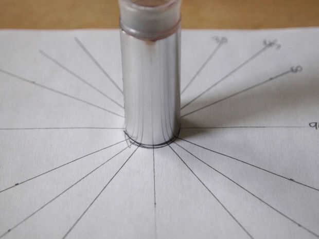 Ya que tenemos una regla, por qué no un transportador. Usé la parte superior del tubo para marcar los ángulos. En primer lugar, me trazó la parte superior del tubo sobre una hoja de papel luego medir algunos ángulos alrededor del círculo. Incluí 0,30,45,60,90 alrededor del círculo en 360. También se puede hacer 15
