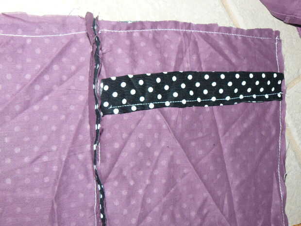 Ahora, usted será coser en sus separadores. Mide 2.5" desde el borde izquierdo de una de sus piezas de tejido principal grande, doblar un separador de la tira por la mitad y coser los bordes crudos en la otra tela dejando aproximadamente 1/4" de espacio en cualquiera de los extremos de la tira. Asegúrese de utilizar un hilo que coincida con la tela principal (yo usé un hilo negro para mina). Hacer lo mismo para las otras tres tiras. Recorte a cualquier exceso tejido. Usted puede hacer los compartimentos un poco más o menos grandes dependiendo de los tamaños de su preferencia y de la lente. Mi tamaño de bolsillo de izquierda a derecha es: