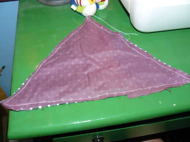 Ahora es el momento para coser juntos las dos piezas triangulares. Coser los lados más cortos en primer lugar, dejando 1/4" del espacio del borde. A continuación, usted querrá tomar el borde de la base y coser en el borde superior de la bolsa. Voltea la bolsa a la espalda con la parte superior a la derecha y colocar la pieza triangular (lateral del liner hacia arriba) con la base a la derecha en la parte superior. Costura recta y corte del exceso.