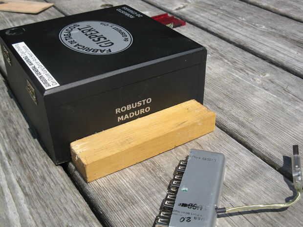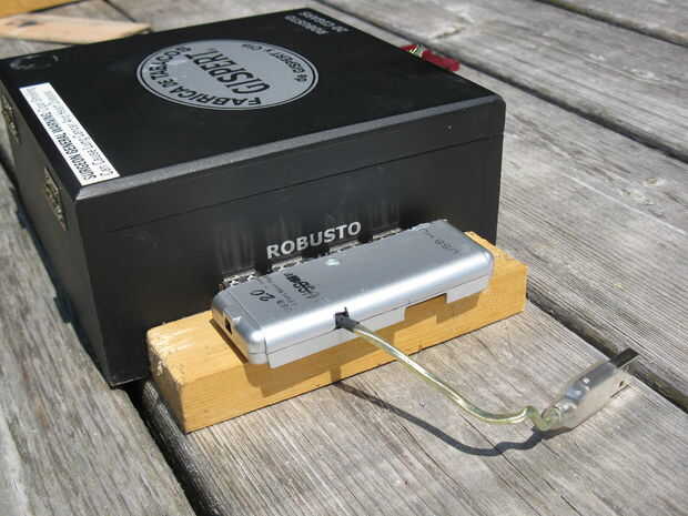8. poner el bloque de madera y el cubo en la caja y compruebe para ver si los puertos pasarán a través de los orificios