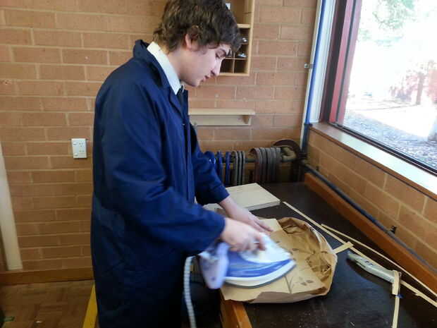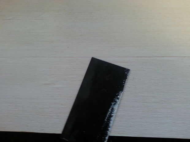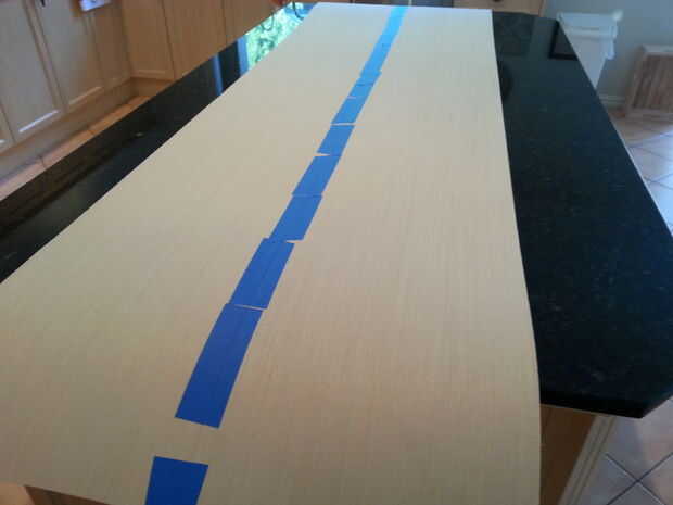 6. entonces usa una plancha aplica mi chapa. Me Coloque la plancha en el ajuste más caliente 3 y empecé a ir mi chapa preencolada en con un trozo de papel entre la chapa y el hierro un tutorial sobre la aplicación de http://www.wikihow.com/Apply-Wood-Veneer chapa de hierro. Luego usé un cuchillo Stanley para cortar la caída de. también usé una rasqueta de chapa para quitar la Junta visible.