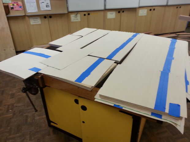 5. se unió a la chapa con cinta de pintor para crear el ancho que necesitaba, había superpuesto la chapa de 2mm para no ver la Unión. Cuando la marca utiliza una regla de metro, lápiz, Plaza y tijeras. Cortar el tamaño de chapa de 15mm cada tamaño en caso de grietas en los bordes. Esto me dio la mejor combinación perfecta posible.