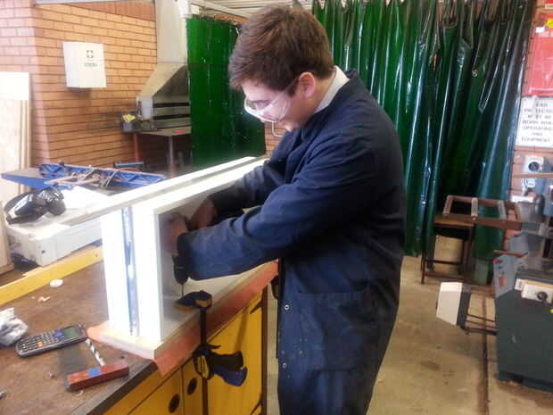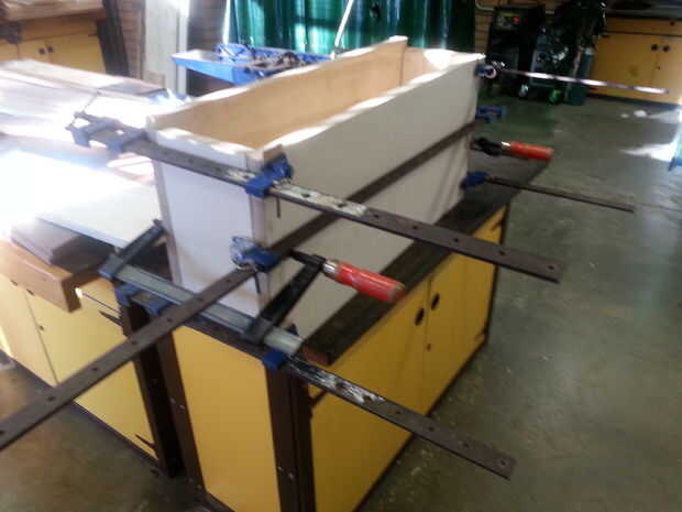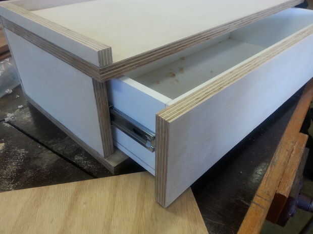 20. cortar el cajón separado de la base usando la Sierra de mesa. Cuando todos mis componentes de cajón estaban listos para pegar comencé pegando usando las abrazaderas de marco y abrazaderas de f, limpiar el exceso de cola con un algodón mojado. Empecé con la estructura (partes superior e inferior) y luego había pegado mi apoyo con mis abalorios.