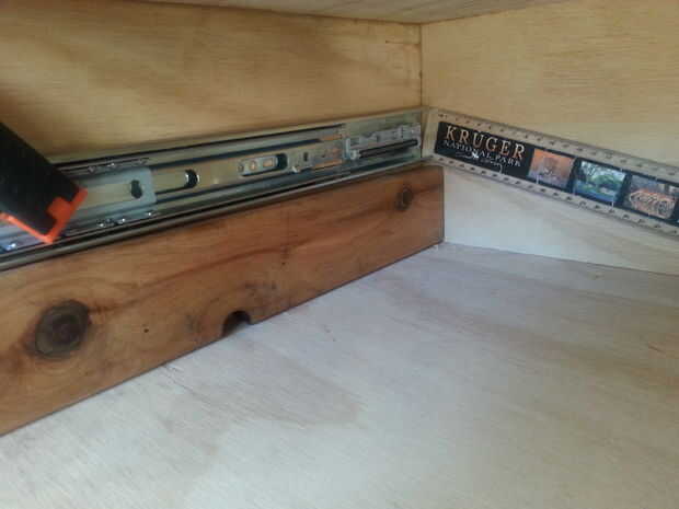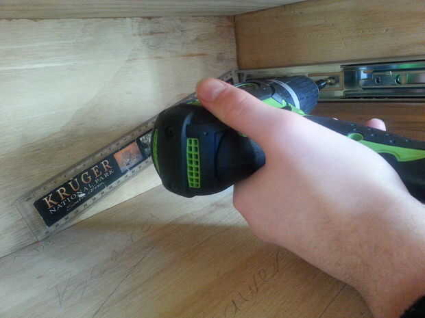 22. después de que los rieles fueron atornillados comencé a atornillar la placa frontal del cajón. Utilizando un lápiz aliado mi cavidad de cajón en el centro de la placa frontal y Plaza de regla. Con rápidos apretones con abrazadera y todo lo había sostenido en la posición. Usé una de 4mm en diámetro broca y un trozo de cinta para marcar la profundidad a perforar previamente. Antes de taladrar previamente Marque 3 puntos del tornillo en el interior pieza frontal de la cavidad del sorteo. Empecé a perforar previamente. Después de agujeros utilicé un 25 mm largo por 5 mm tornillo y atornillado a la cavidad de la placa frontal.