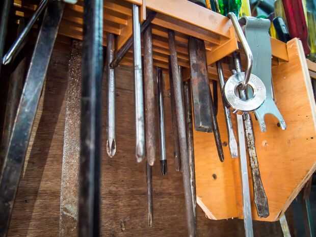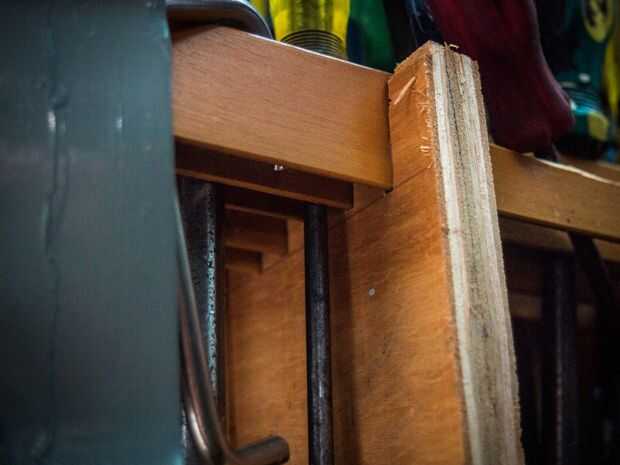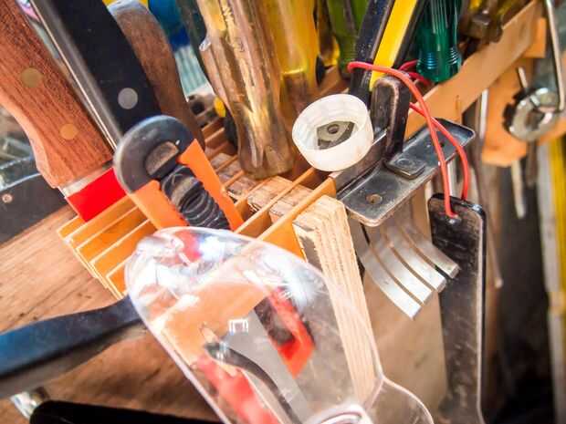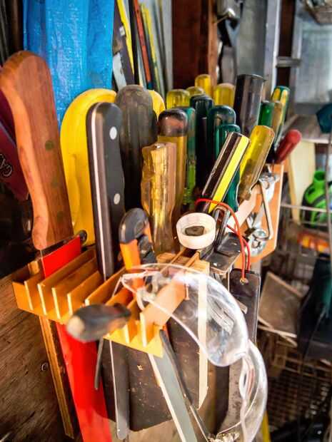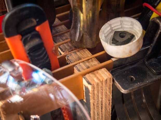 Encontré que el ancho de mi gota sierra corte era el mismo que el ancho de las persianas de madera pieza tenía. Todo lo que tenía que hacer era hacer rajas con distancias variables entre ellos (para acomodar una gama más amplia de herramientas), cortar las persianas (cortando las piezas con agujeros) y pegar en su lugar. Feo pero funciona bien.