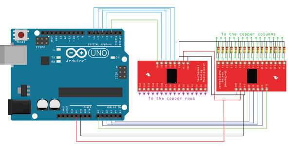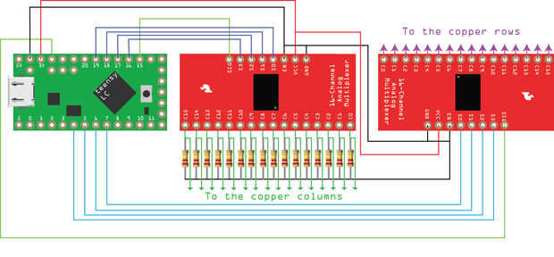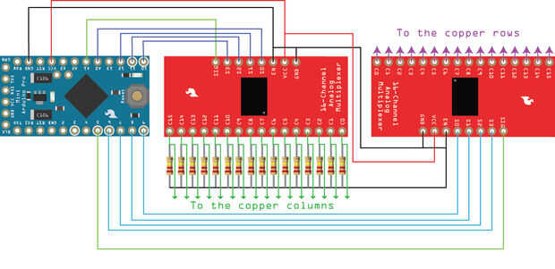 - Nos estamos conectando resistencias de 16 para hacer divisores de voltaje en el multiplexor conectado a la entrada analógica.