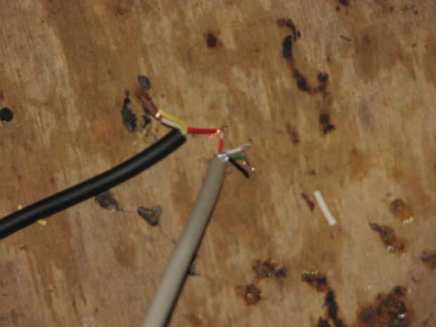 toque los cables juntos, entonces hotglue (pegarse en el orificio de la cola y tirando de él obras buenas y hace más delgado y tiene un riesgo menor para pegado de otros alambres accidentalmente) o usted puede añadir un goteo de soldadura de primera para asegurar un contacto adecuado.