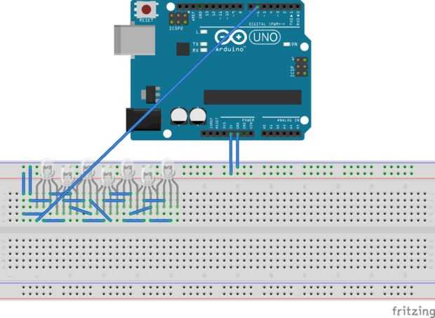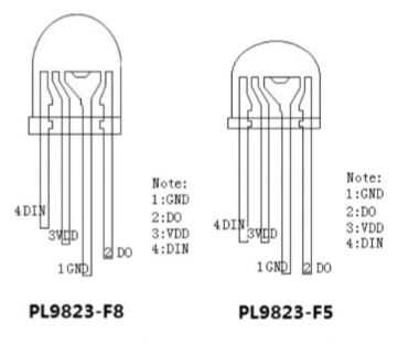 Se puede ver en la imagen el circuito. Prestar atención al led PL9823's modelo. Si utilizas un modelo F-8 (véase la imagen) se puede utilizar el tiempo uno de los pines como toma de tierra. Si utilizas el modelo F-5 el GND es el segundo pasador largo.