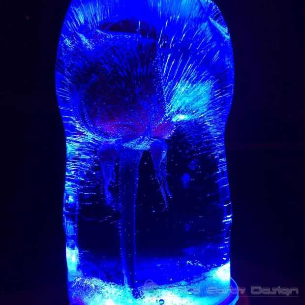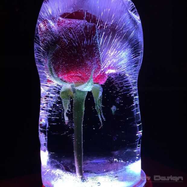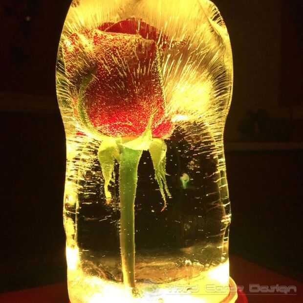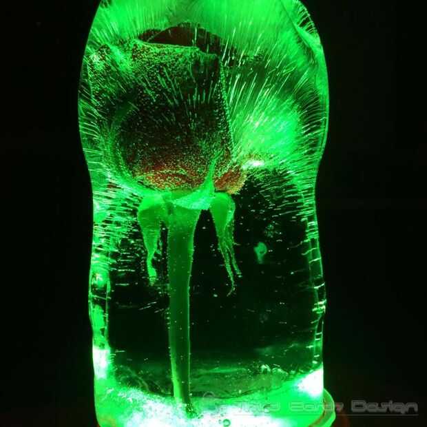 Congelada, simplemente tener cuidado de cortar el tallo de rosa que se expone del hielo y quite con cuidado el cilindro de hielo de la botella de plástico. Si luchas por conseguirlo gratis encontrarás que correr algunos agua sobre la parte exterior de la botella ayudarán a liberar más fácilmente.