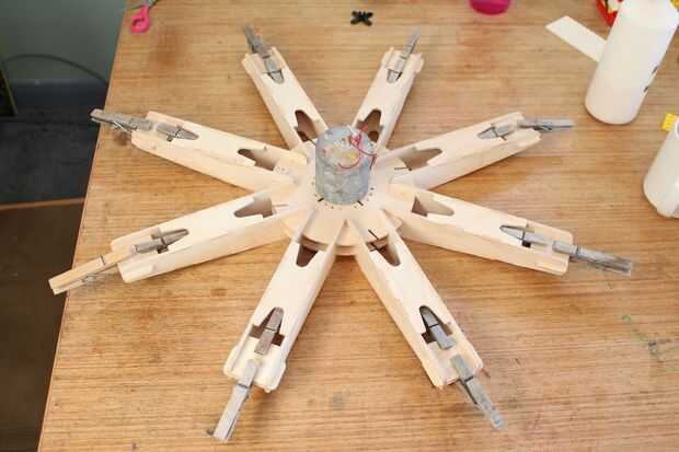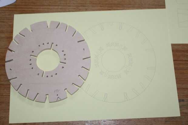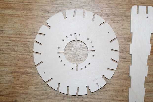 Otra vez el eje central está hecho de 2 piezas de 3mm o 1/8 capas y cortar juntos, te darás cuenta en el plan hay un agujero extra al azar en medio de una de las ranuras del brazo, esto es para ayudar a realinear los dos bits si pierde la pista de que forma hacia arriba y alrededor van.