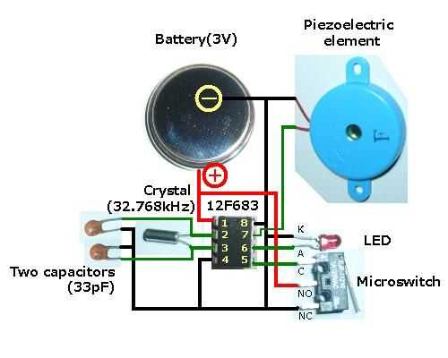10, sólo siete partes de un crystal(32.768kHz), dos capacitors(33pF), un LED, un elemento piezoeléctrico, un microswitch y un battery(3V) se requiere además de PIC12F683 (microcontrolador de 8 pines hecha por tecnología de Microchip) en que fue escrito el programa. Si hay 10 minutos, cualquiera puede hacer.